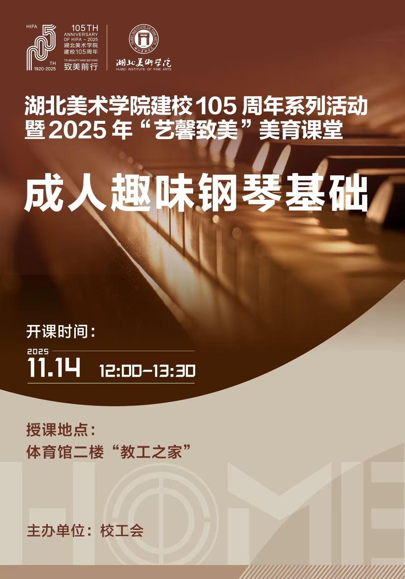 为庆祝建校105周年,进一步提升教职工艺术素养,繁荣校园文化,落实立德树人根本任务,学校工会于今年秋季学期成功开设“艺馨致美”教职工《美育课堂》,以美育人、以文化人,助力教职工全面发展,营造崇德尚艺的校园风尚。